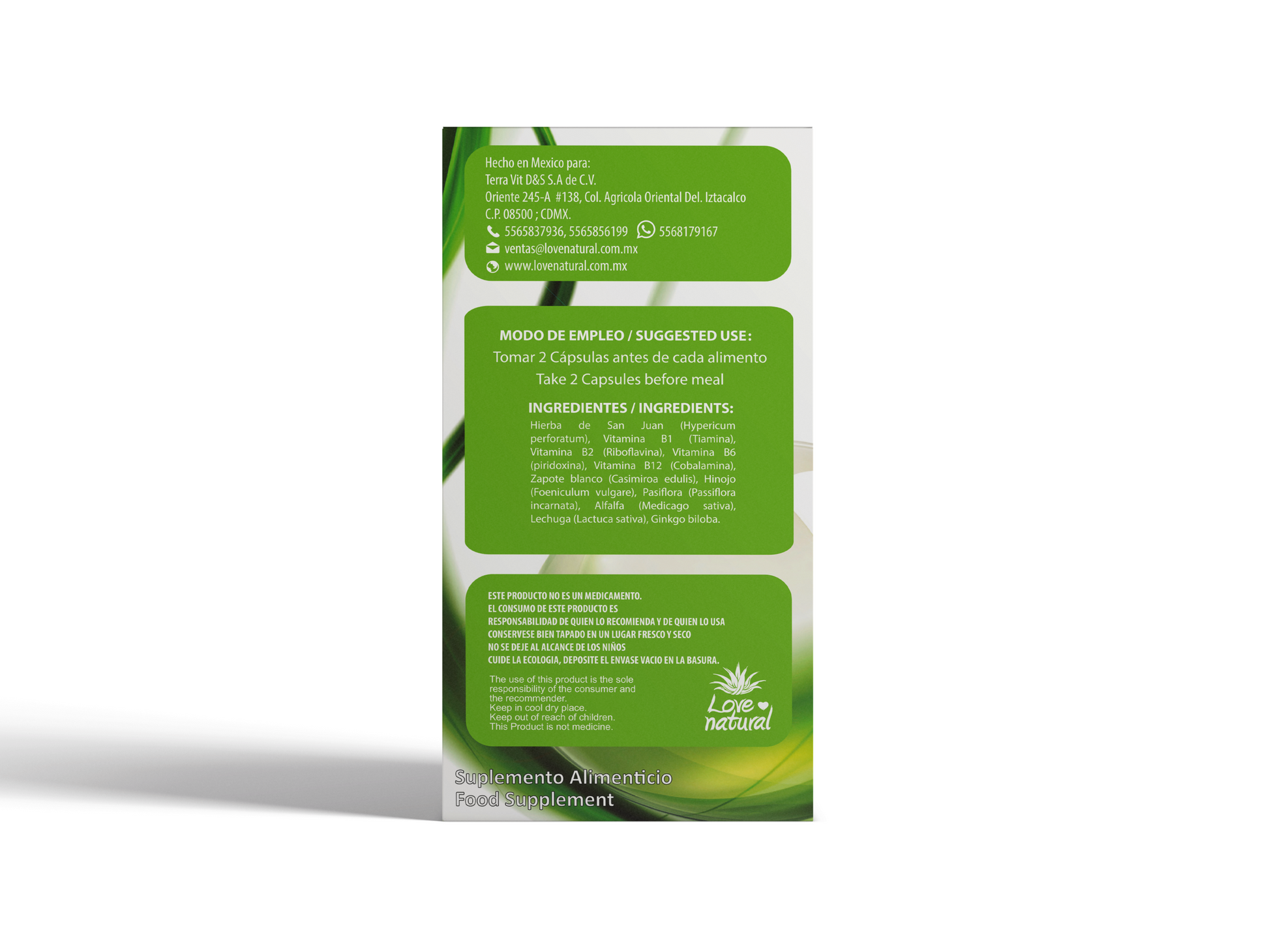 Hierba de San Juan, Vitamina B1, Vitamina B2, Vitamina B6, Vitamina B12, Zapote Blanco, Hinojo, Pasiflora, Alfalfa, Lechuga, Ginkgo Biloba.