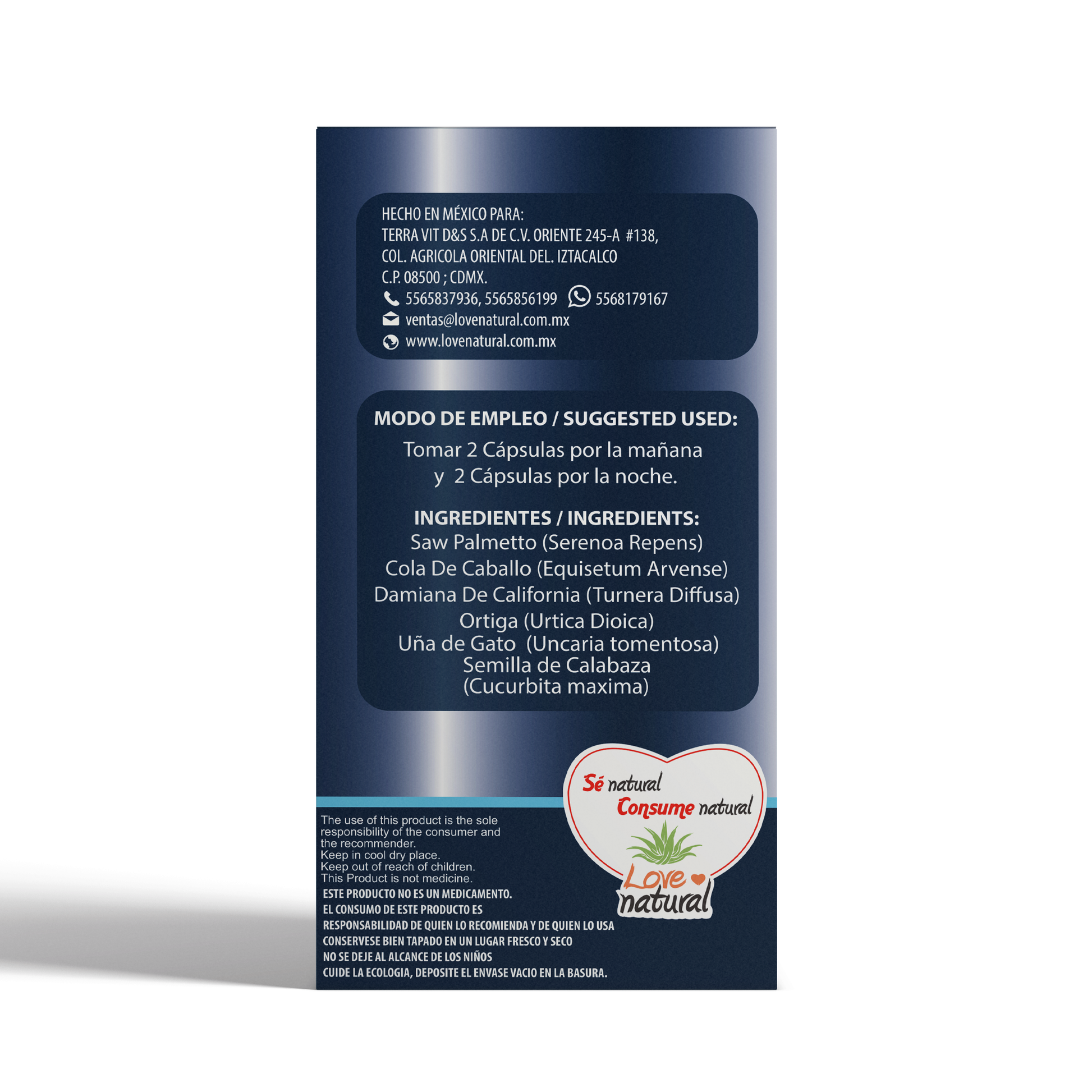 Saw Palmetto, Cola de Caballo, Damiana de California, Ortiga, Uña de Gato, Semilla de Calabaza.