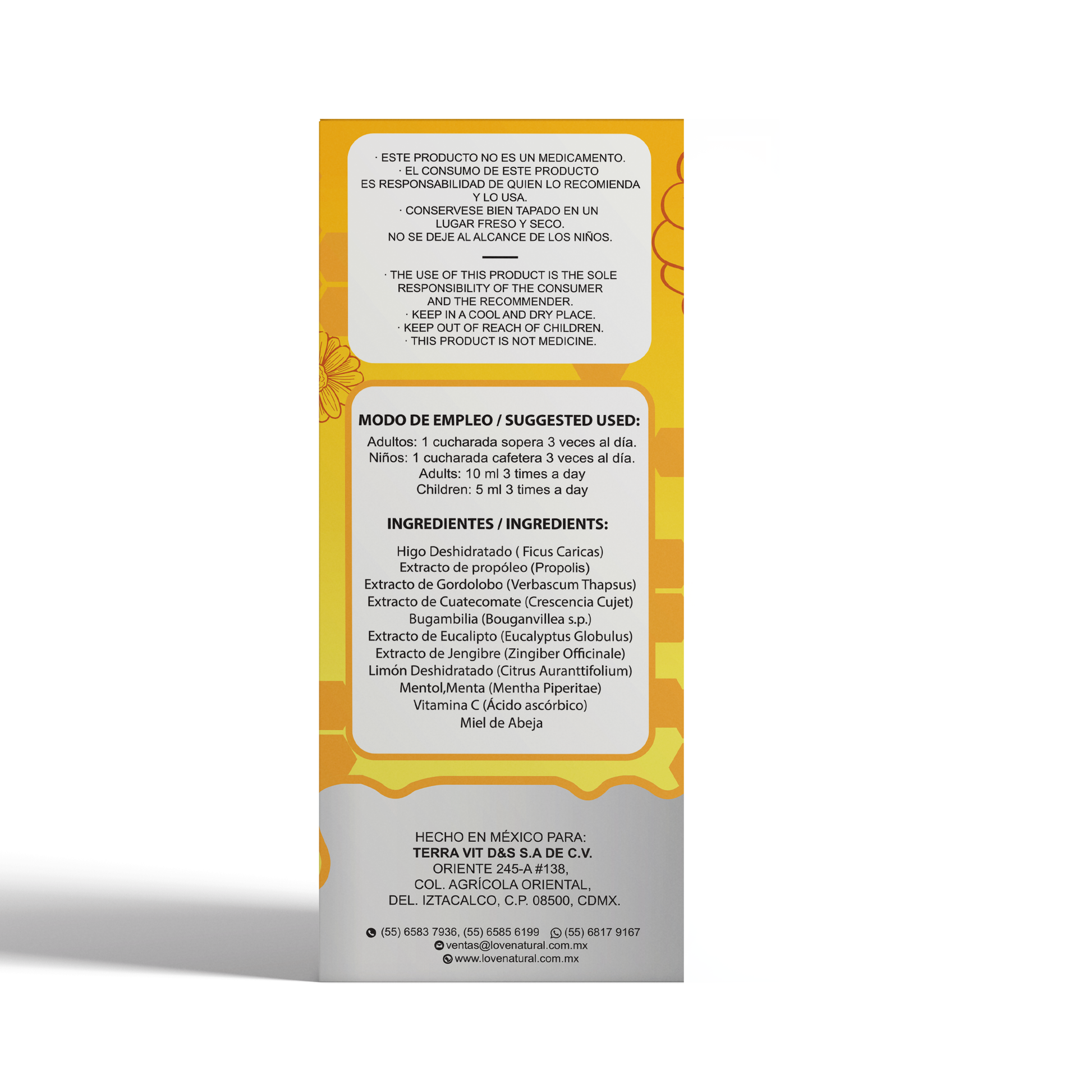 Miel de Abeja, Higo Deshidratado, Extracto de propóleo, Extracto de Gordolobo, Extracto de Cuatecomate, Bugambilia, Extracto de Eucalipto, Extracto de Jengibre, Limón Deshidratado, Vitamina C.